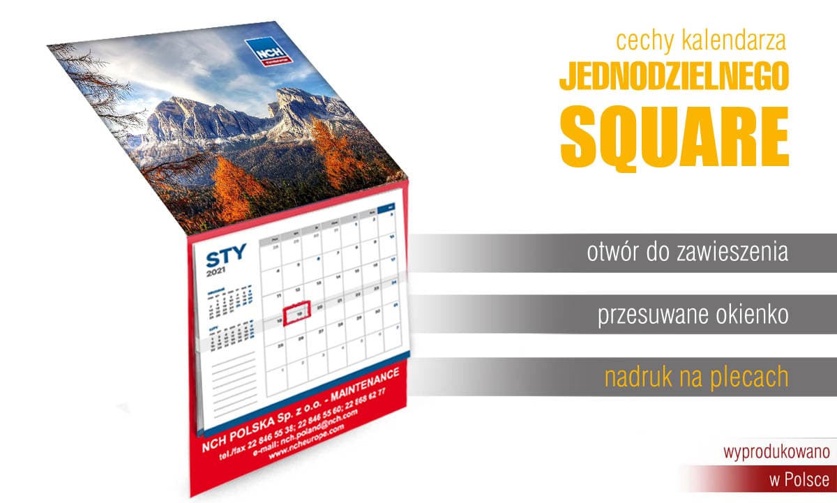 Poniżej prezentujemy nasz największy jednodzielny kalendarz firmowy. Kalendarz jednodzielny LUX SQUARE posiada największą powierzchnię reklamową wśród naszych kalendarzy jednodzielnych i ze swoim biznesowym kalendarium z miejscem na notatki jest odpowiedzią na rosnące potrzeby Klientów. Informacje o firmie można nadrukować zarówno na główce i stopce. Kalendarz jednodzielny Square posiada główkę kwadratową dzięki czemu otrzymujecie Państwo zupełnie nową możliwość aranżacji powierzchni reklamowej. Jesteśmy producentem kalendarzy jednodzielnych, a oferowana wersja to nowość, która zaskoczy Państwa Klientów.