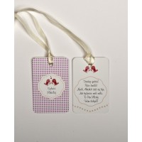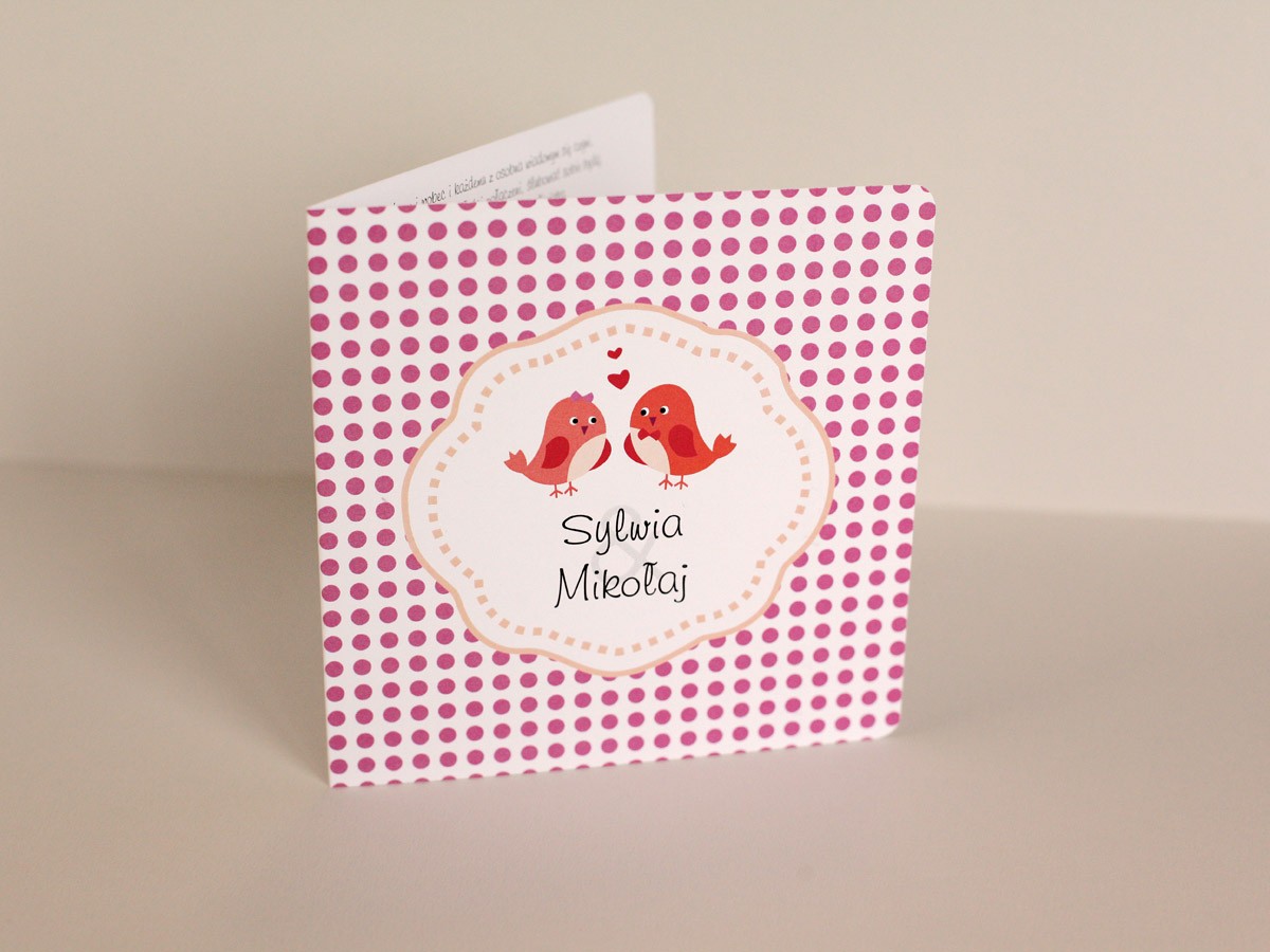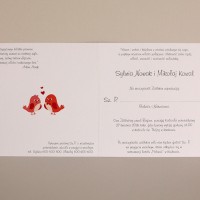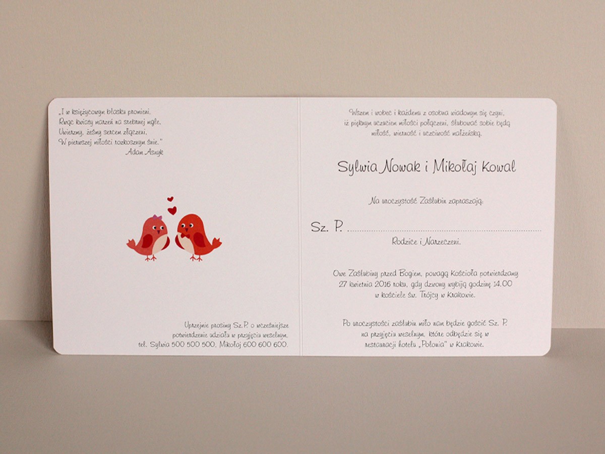 Cena zaproszenia zawiera wykonanie nadruku na papierze KREDA MAT o gramaturze 350g. Po złożeniu ma kształt kwadratu z zaokrąglonymi rogami o wymiarach 13,5 x 13,5cm. Zaproszenie zadrukowane jest z obu stron, z zewnątrz kolorowa okładka, wewnątrz treść (font dowolny) wraz z ornamentalną ilustracją.
