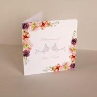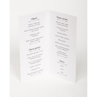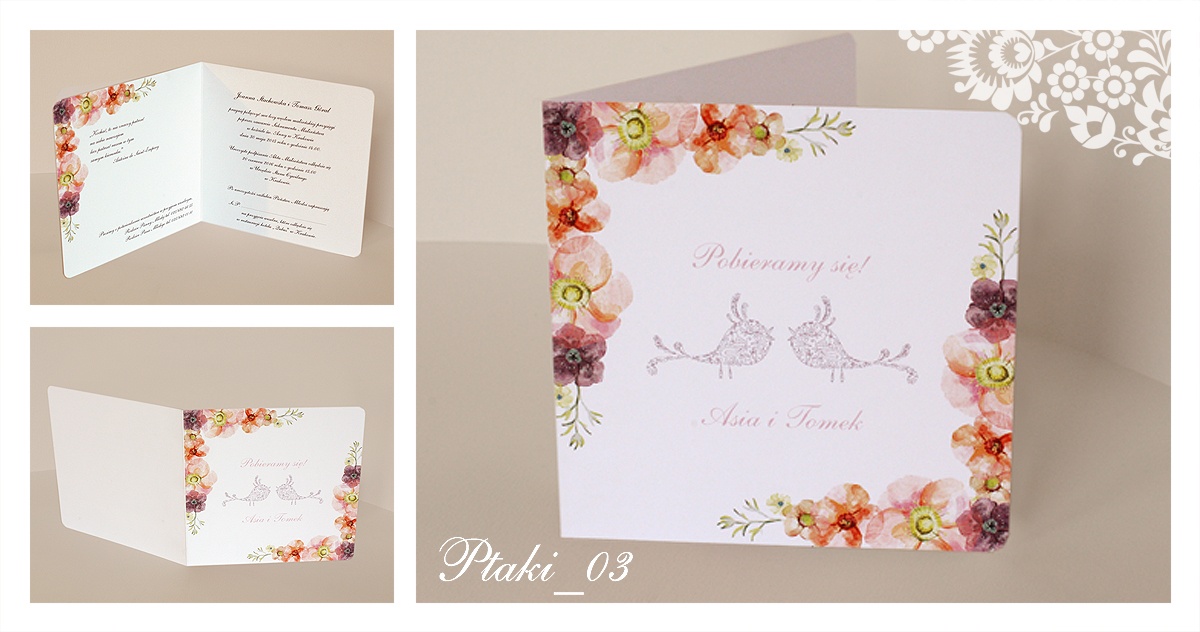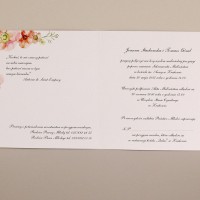 Cena zaproszenia zawiera wykonanie nadruku na papierze KREDA MAT o gramaturze 350g. Po złożeniu ma kształt kwadratu z zaokrąglonymi rogami o wymiarach 13,5 x 13,5cm. Zaproszenie zadrukowane jest z obu stron, z zewnątrz kolorowa okładka, wewnątrz treść (font dowolny) wraz z ornamentalną ilustracją.