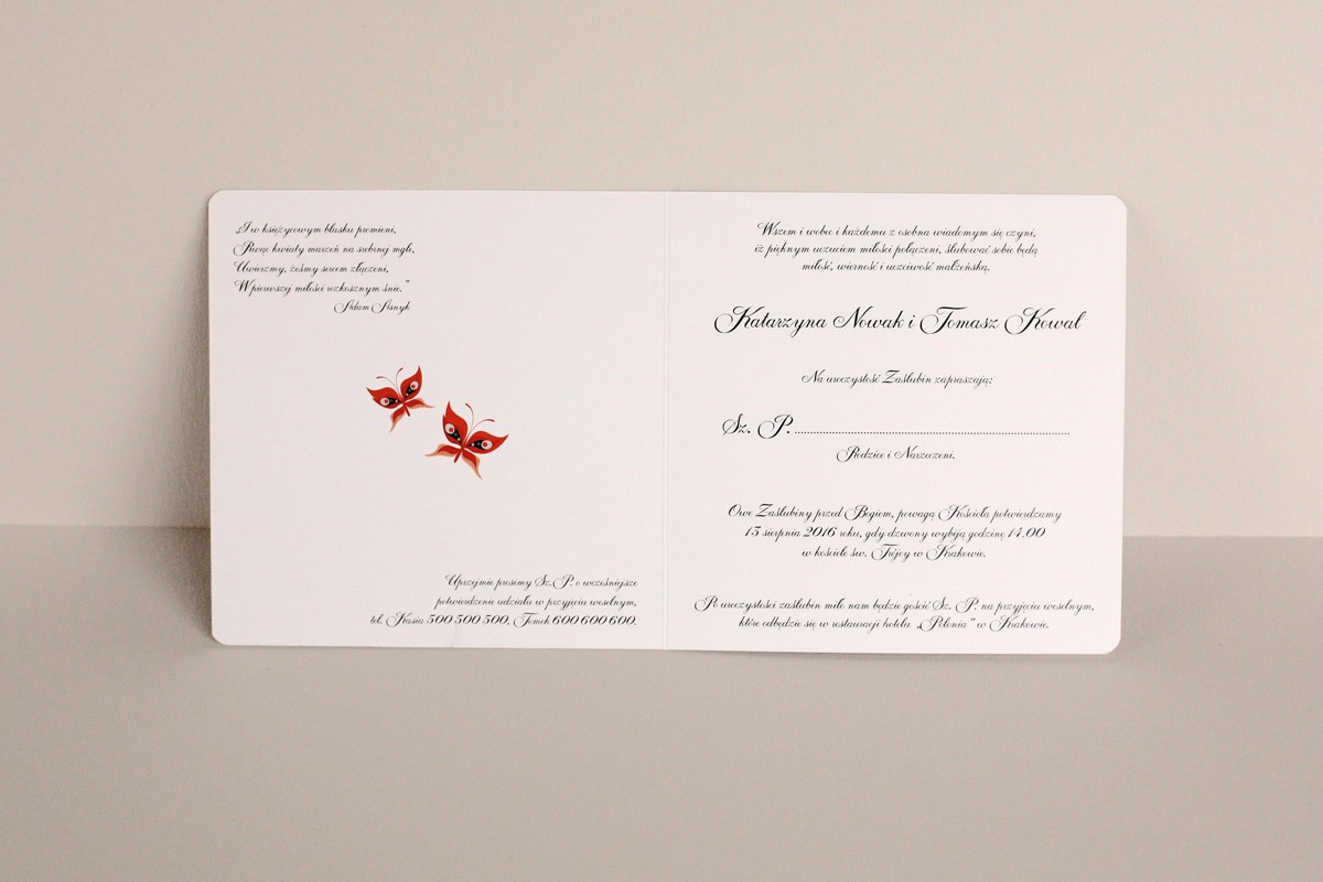 Cena zaproszenia zawiera wykonanie nadruku na papierze KREDA MAT o gramaturze 350g. Po złożeniu ma kształt kwadratu z zaokrąglonymi rogami o wymiarach 13,5 x 13,5cm. Zaproszenie zadrukowane jest z obu stron, z zewnątrz kolorowa okładka, wewnątrz treść (font dowolny) wraz z ornamentalną ilustracją.