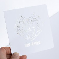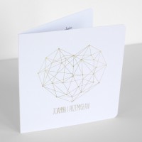 Cena zaproszenia zawiera wykonanie druku na papierze kreda mat o gramaturze 350g. Po złożeniu ma kształt kwadratu z zaokrąglonymi rogami o wymiarach 13,5 x 13,5cm. Zaproszenie zadrukowane jest z obu stron: z zewnątrz druk wykonany jest złotą, pięknie mieniącą się folią, wewnątrz standardowo druk jest czarno biały. Zaproszenie na okładce posiada złocone imiona młodych i datę ślubu, co podkreśla niepowtarzalny wygląd.