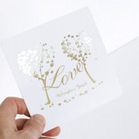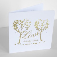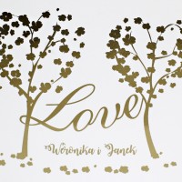 Cena zaproszenia zawiera wykonanie druku na papierze kreda mat o gramaturze 350g. Po złożeniu ma kształt kwadratu z zaokrąglonymi rogami o wymiarach 13,5 x 13,5cm. Zaproszenie zadrukowane jest z obu stron: z zewnątrz druk wykonany jest złotą, pięknie mieniącą się folią, wewnątrz standardowo druk jest czarno biały. Zaproszenie na okładce posiada złocone imiona młodych i datę ślubu, co podkreśla niepowtarzalny wygląd.