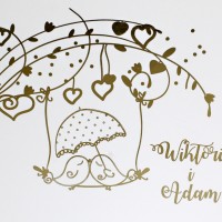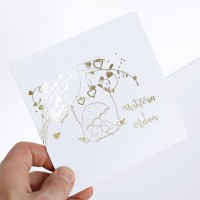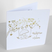 Cena zaproszenia zawiera wykonanie druku na papierze kreda mat o gramaturze 350g. Po złożeniu ma kształt kwadratu z zaokrąglonymi rogami o wymiarach 13,5 x 13,5cm. Zaproszenie zadrukowane jest z obu stron: z zewnątrz druk wykonany jest złotą, pięknie mieniącą się folią, wewnątrz standardowo druk jest czarno biały. Zaproszenie na okładce posiada złocone imiona młodych i datę ślubu, co podkreśla niepowtarzalny wygląd.