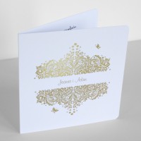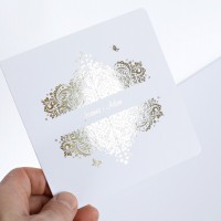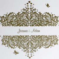 Cena zaproszenia zawiera wykonanie druku na papierze kreda mat o gramaturze 350g. Po złożeniu ma kształt kwadratu z zaokrąglonymi rogami o wymiarach 13,5 x 13,5cm. Zaproszenie zadrukowane jest z obu stron: z zewnątrz druk wykonany jest złotą, pięknie mieniącą się folią, wewnątrz standardowo druk jest czarno biały. Zaproszenie na okładce posiada złocone imiona młodych i datę ślubu, co podkreśla niepowtarzalny wygląd.