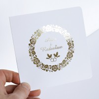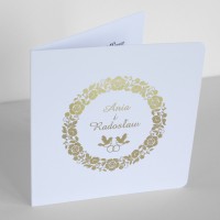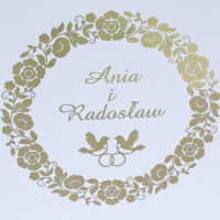 Cena zaproszenia zawiera wykonanie druku na papierze kreda mat o gramaturze 350g. Po złożeniu ma kształt kwadratu z zaokrąglonymi rogami o wymiarach 13,5 x 13,5cm. Zaproszenie zadrukowane jest z obu stron: z zewnątrz druk wykonany jest złotą, pięknie mieniącą się folią, wewnątrz standardowo druk jest czarno biały. Zaproszenie na okładce posiada złocone imiona młodych i datę ślubu, co podkreśla niepowtarzalny wygląd.