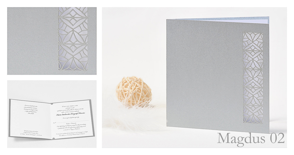 Cena zaproszenia zawiera obwolutę z wyciętym laserowo wzorem na ozdobnym papierze oraz białą wkładkę z zadrukowaną na czarno treścią. Po złożeniu ma kształt kwadratu o wymiarach 13,5 x 13,5cm. Wkładka wykonana jest z satyny 90g umieszczonej w zaproszeniu za pomocą zaczepów.