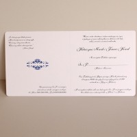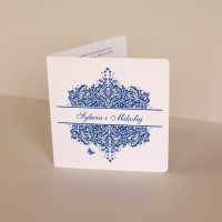 Cena zaproszenia zawiera wykonanie nadruku na papierze KREDA MAT o gramaturze 350g. Po złożeniu ma kształt kwadratu z zaokrąglonymi rogami o wymiarach 13,5 x 13,5cm. Zaproszenie zadrukowane jest z obu stron, z zewnątrz kolorowa okładka, wewnątrz treść (font dowolny) wraz z ornamentalną ilustracją.