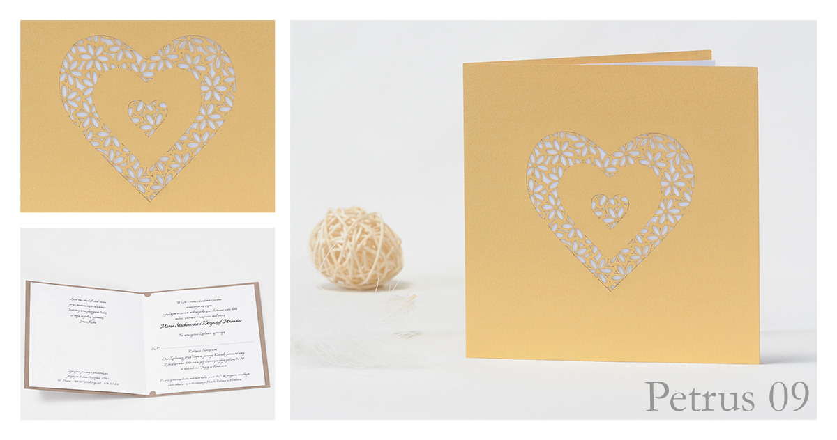 Cena zaproszenia zawiera obwolutę z wyciętym laserowo wzorem na ozdobnym papierze oraz białą wkładkę z zadrukowaną na czarno treścią. Po złożeniu ma kształt kwadratu o wymiarach 13,5 x 13,5cm. Wkładka wykonana jest z satyny 90g umieszczonej w zaproszeniu za pomocą zaczepów.